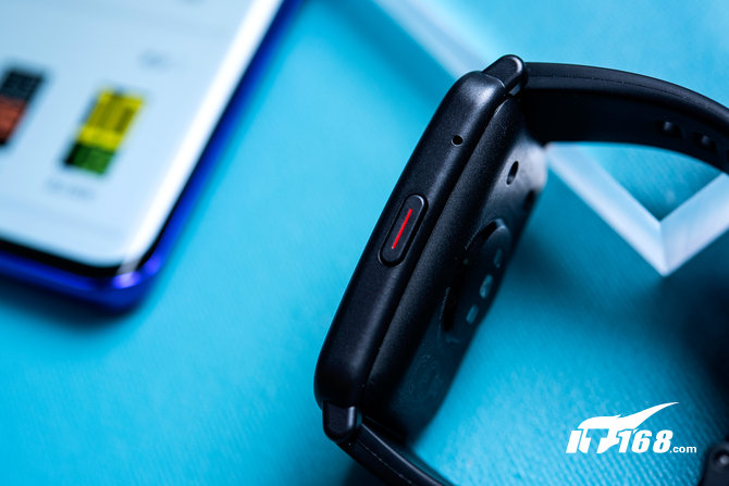 荣耀手表ES侧面只有一个按键,也让表体显得更为简约,按键上有一个红色的标记,特别显眼。