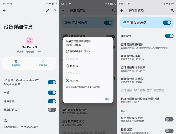 我们这里使用了一台moto edge S30手机连接漫步者NeoBuds S耳机进行测试,手机在通过蓝牙连接上了耳机后,在设备详细信息里打开“HD音频:Qualcomm aptX Adaptive音频”选项后,即可体验骁龙畅听技术。不过需要注意的是,我们测试所用的moto edge S30在打开了骁龙畅听aptX Adaptive相关选项后,默认仅会使用24-bit 48KHz音频进行传输,虽然已经达到了无损音频的标准,但是想体验到24-bit 96KHz音质的话,则需要我们到Android系统的开发者选项中去更改,解锁开发者选项并不算太难,不过每次耳机重连后蓝牙音频采样率都会恢复至默认的48KHz,这点属实有些不太人性化。