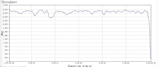 首先我们进行拉流测试。我们发现中兴问天BE7200Pro+的最 高速度接近到2800Mbps的高速,这个速度意味着在局域网内,用户可以享受到极速的数据传输,满足各种高带宽需求。这也印证了路由器在Wi-Fi 7标准下的强大性能表现。