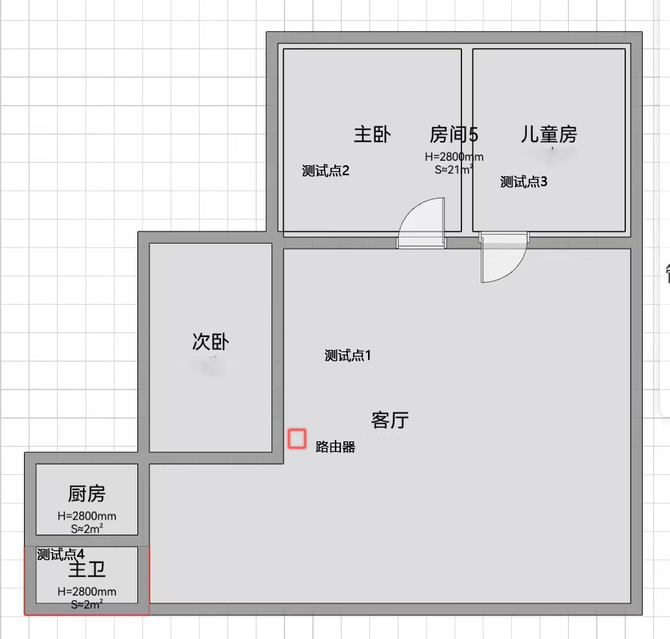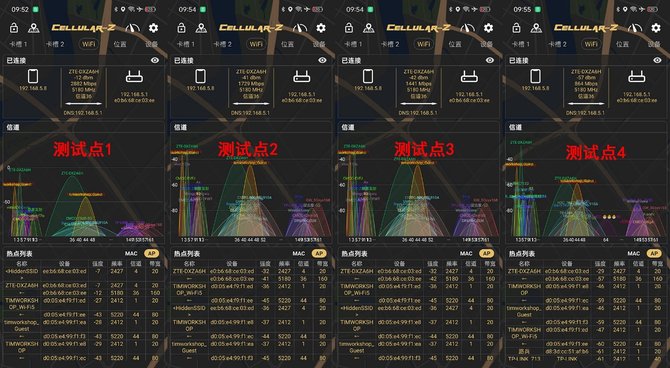 实际测试在一个90平方的空间内进行,针对路由器的信号,使用一台支持Wi-Fi 7的手机进行信号测试,测试涉及4个测试点,包括有穿墙的环境。