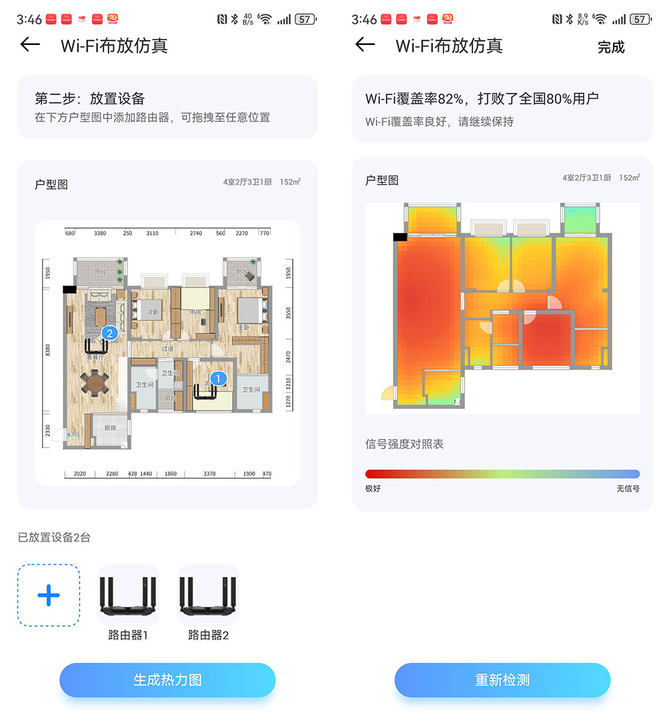 通过 WIFI 布放仿真功能,用户可以模拟家庭网络覆盖情况,一键获取户型图,全屋网络状况一目了然。这一功能使用户能更科学地规划 Wi-Fi 设备的布局,以最大化提高信号覆盖。
