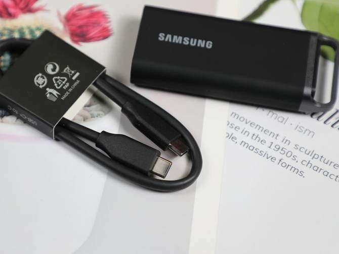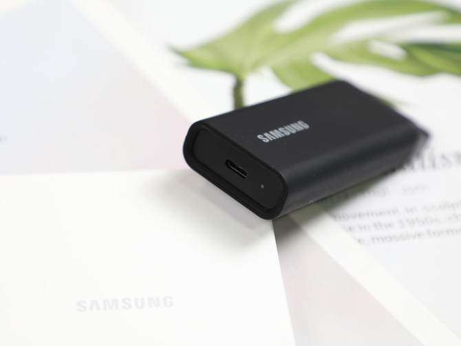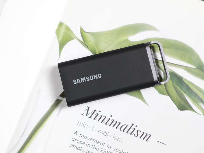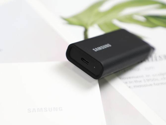 从外观看,三星 T5 EVO 8TB 完全打破了 “大容量硬盘必笨重” 的印象,机身尺寸仅40×95×17mm,比普通智能手机还要纤细,重量约 98.7g,拿在手里几乎没什么存在感,日常出门塞进背包侧袋、甚至挂在钥匙链上(机身自带金属环设计)都毫无压力。