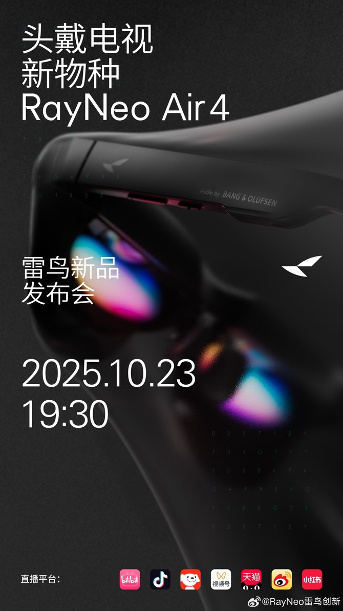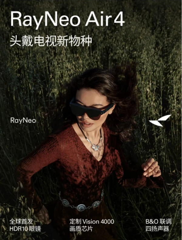 10 月 20 日,国内 AR 眼镜头部品牌雷鸟创新借品牌四周年契机官方宣布,将推出头戴电视新物种 —— 全球首款支持 HDR 显示的观影眼镜 RayNeo Air4,将于10月23日发布。
