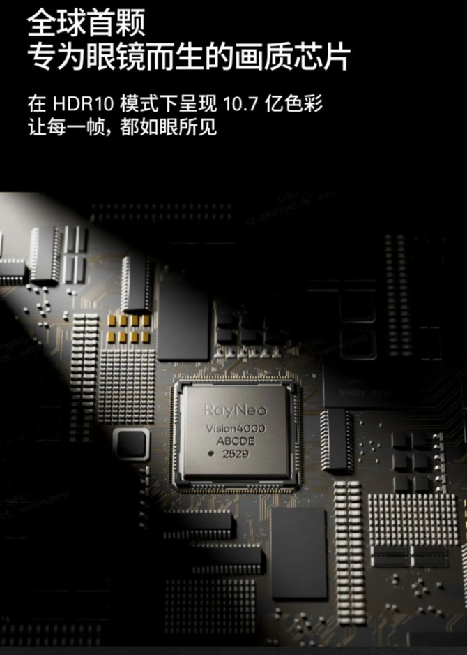 作为全球首款支持 HDR 的观影眼镜,RayNeo Air4 在画质上实现双重关键突破。其搭载全球首颗专为眼镜定制的 Vision 4000 画质芯片,该芯片是画质升级的核心动力,能精准优化每一帧画面的细节与色彩。