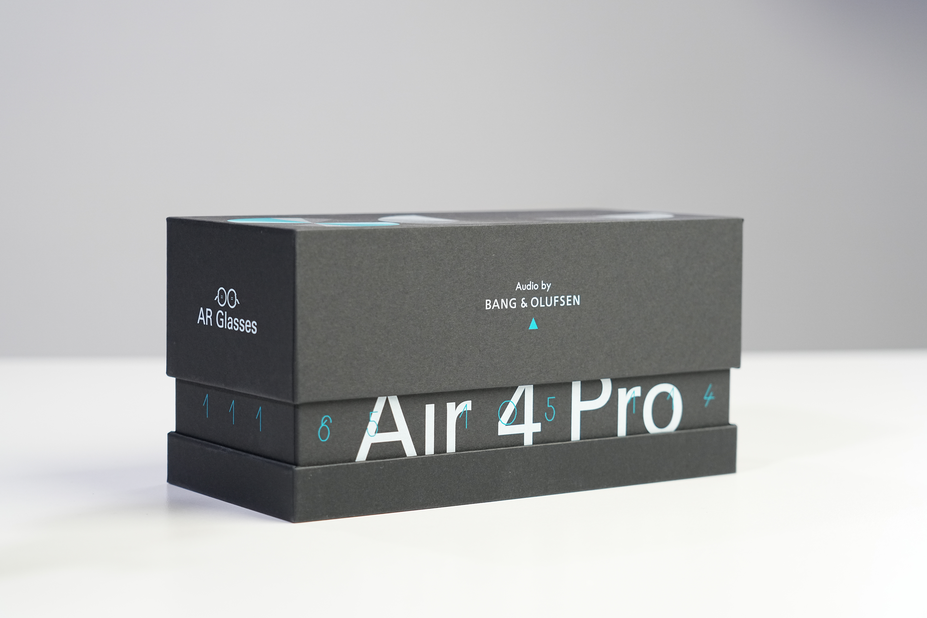 包装我们可以看到,雷鸟Air 4 Pro采用黑色的硬盒包装设计,配合上独特的天蓝色点缀,整个包装的高级感还是非常不错的。