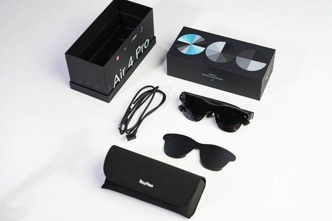 打开包装,雷鸟Air 4 Pro的所有配件都在上面了,包括一个可随身携带的眼镜收纳包、一根双头Type-C的视频、充电线,雷鸟AR眼镜和一个遮光罩。