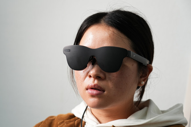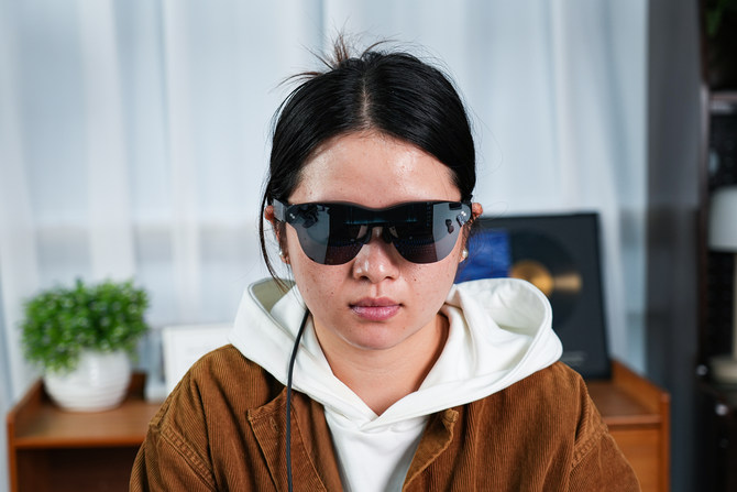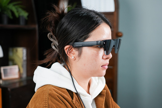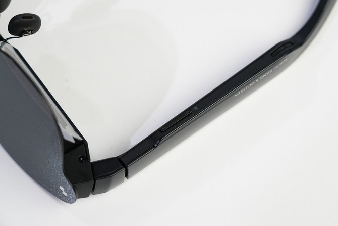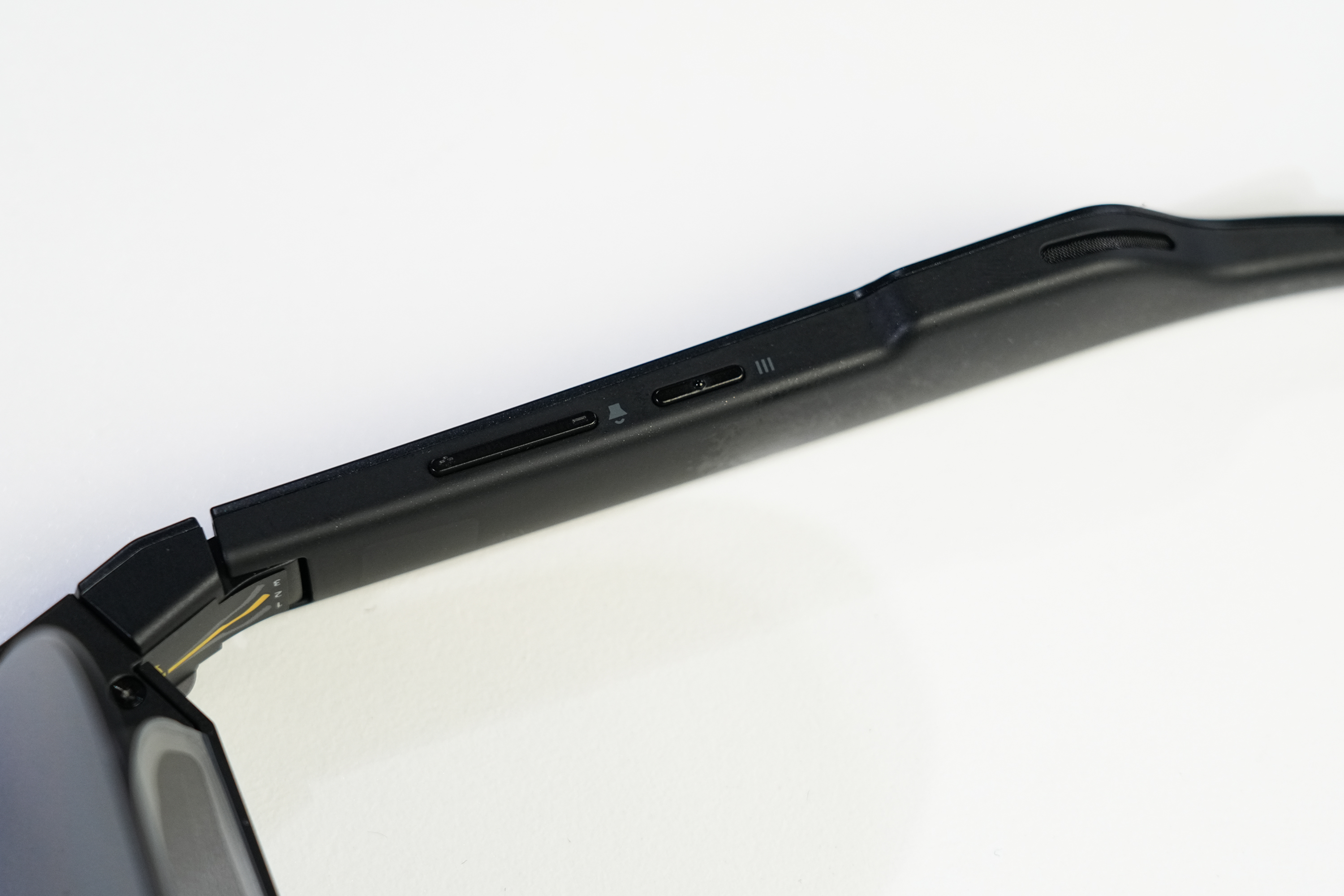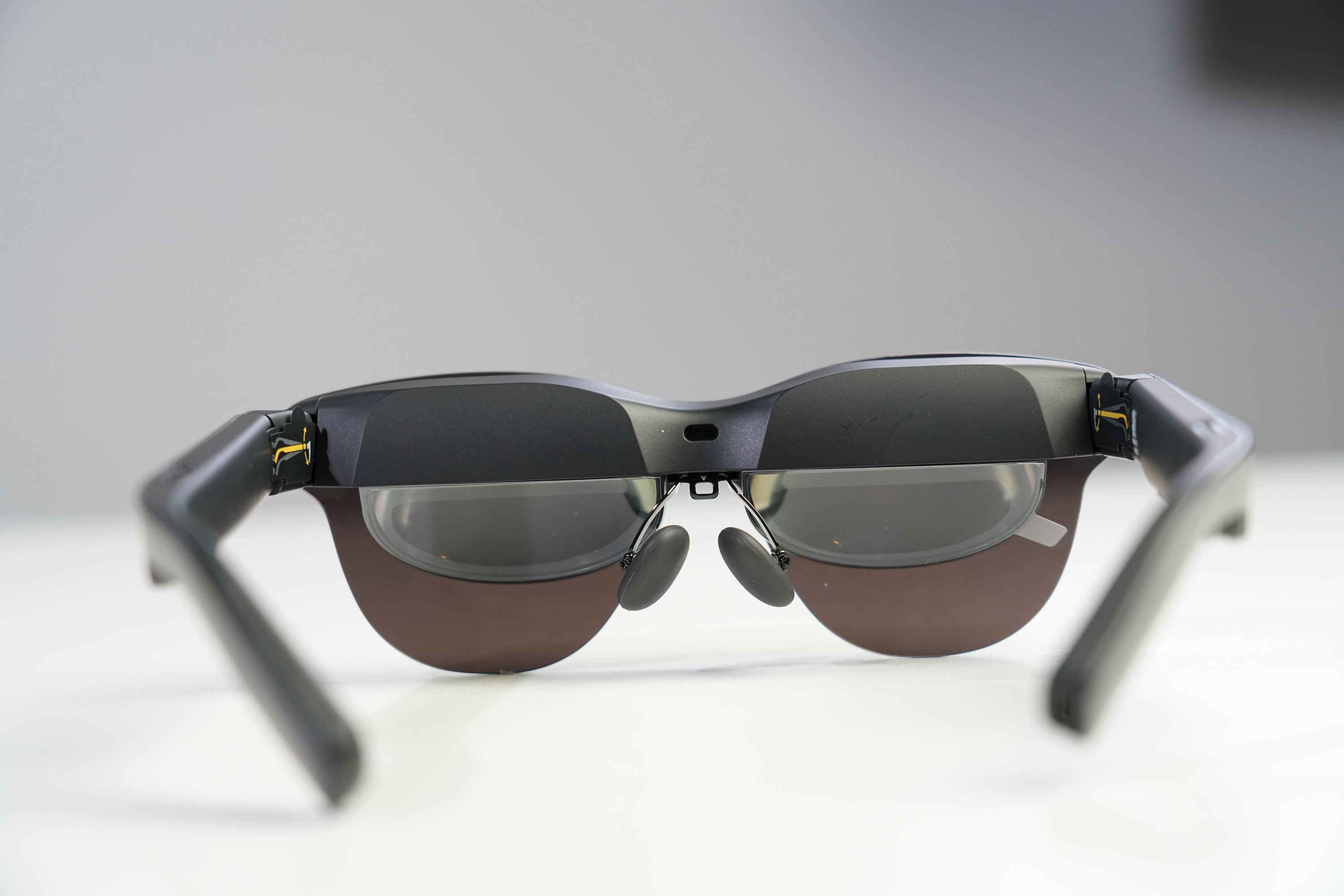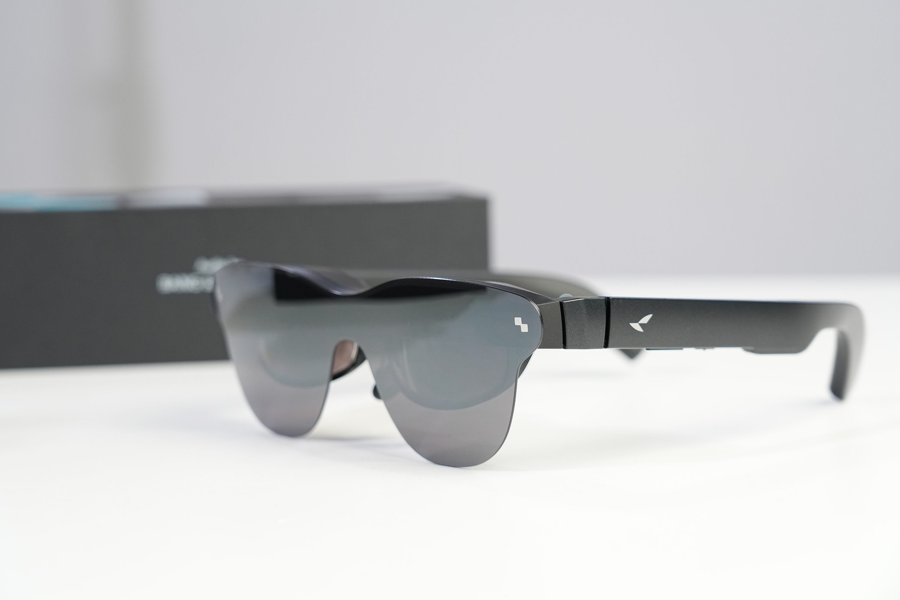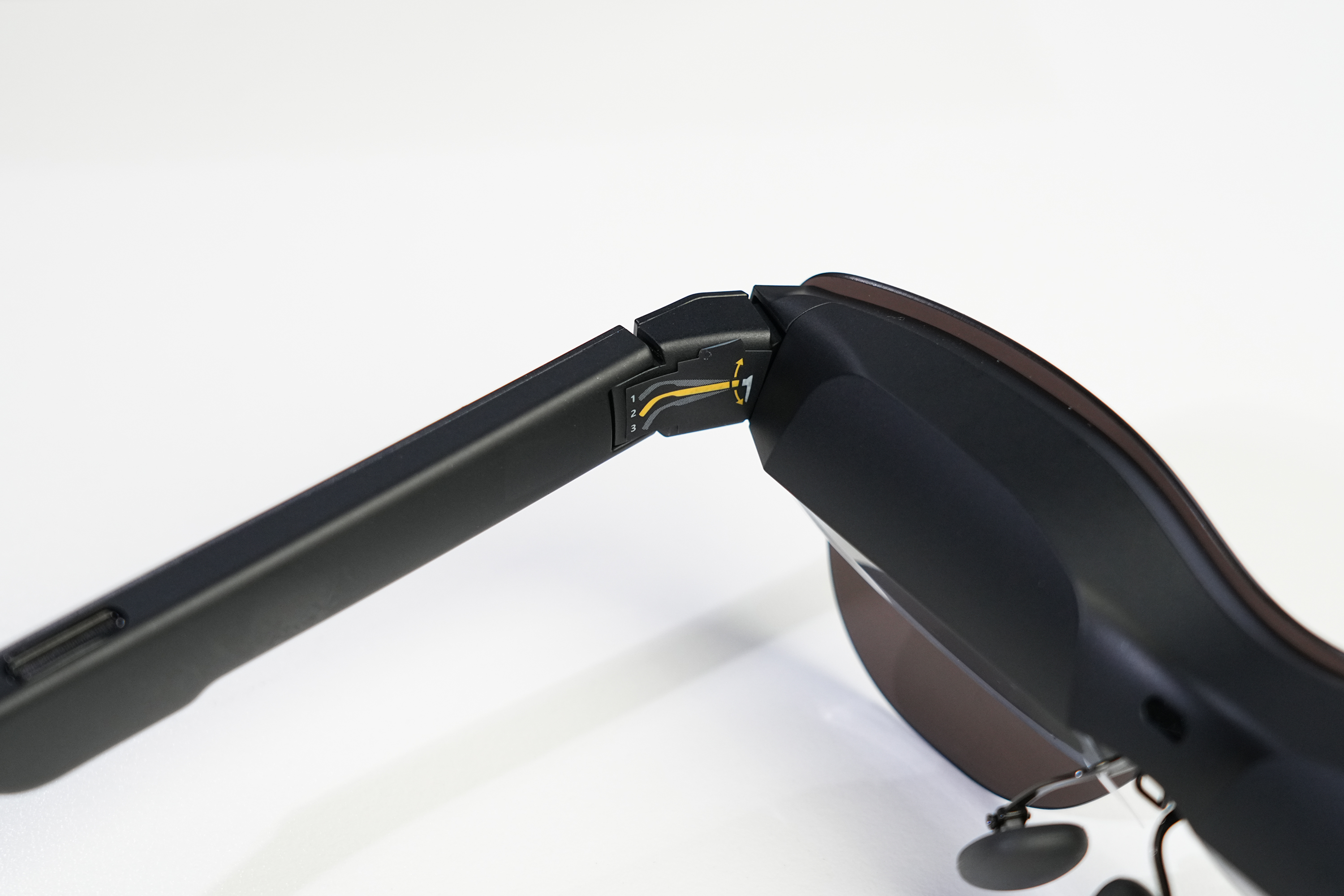 对于初次体验的用户来讲,可是实现完全沉浸式的体验,并且这款眼镜前半部分采用了是墨镜的材质,在正常的办公室光线环境下,眼镜内部画面的亮度是足够出色的,这里我默认调整的是最高亮度,镜腿上也有快捷亮度调整,用户可以根据环境光线调整亮度。如果你想要完全沉浸式的观看体验,可以使用遮光罩,这样就能完全屏蔽外部的光线干扰,是类似影院模式,观感更好。