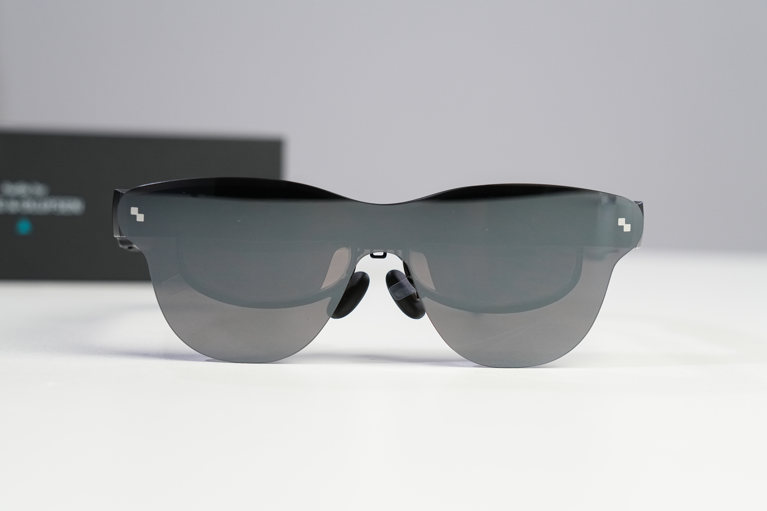 眼镜在外观设计上,看上去和潮流墨镜没有太大的区别,整个眼镜镜片的形状曲线过度自然,外观设计优秀,并且半框的设计,配合上大的弧角,能够很好地修饰脸型,即便在办公室这种环境佩戴,也像一台高级的蓝光护眼镜,不会显得特别突兀,方便我们摸鱼。