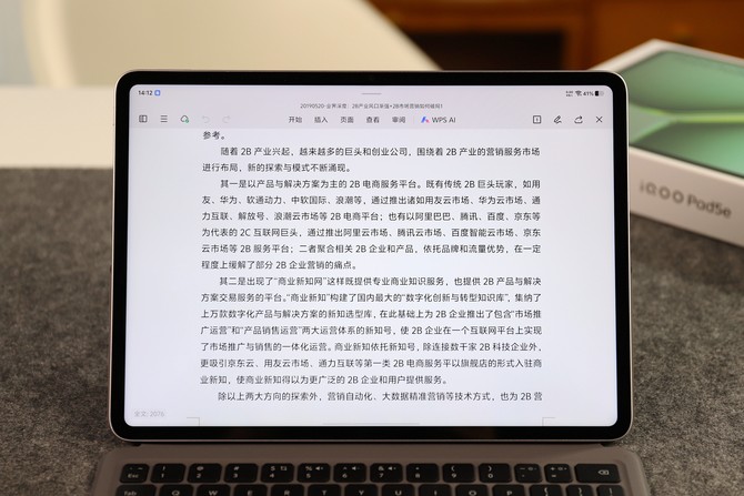 首先是 “文档处理自由”。iQOO Pad5e 预装了PC 级 WPS,打开 Word、Excel、PPT 时,界面和操作逻辑与电脑几乎一致,包括复杂的表格编辑、公式插入和幻灯片动画设置等都直接在平板上操作完成,而且搭配的键盘保护壳,就算是输入大量的文字也不发愁,效率自然就不低。