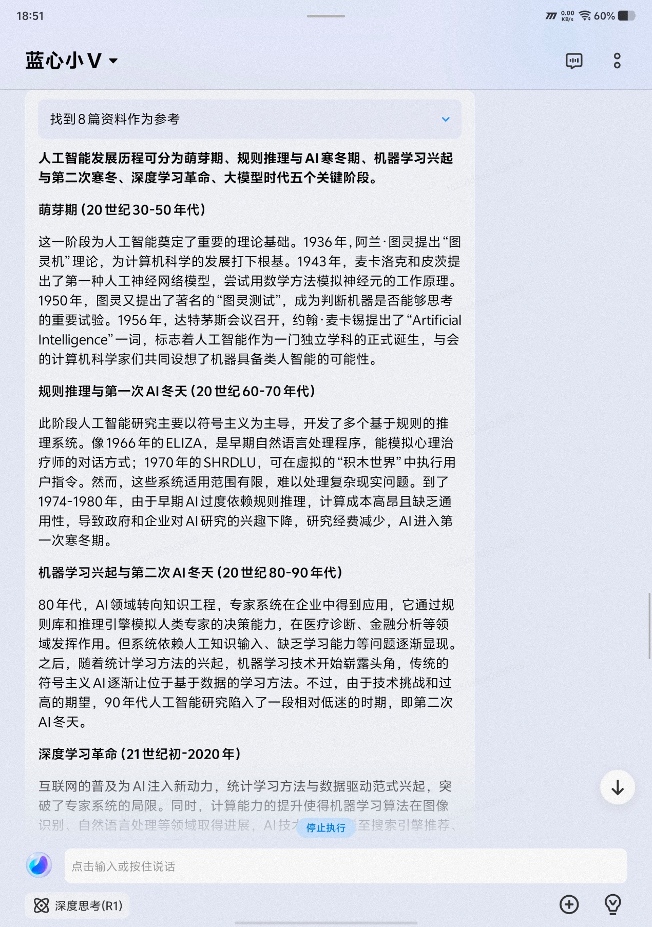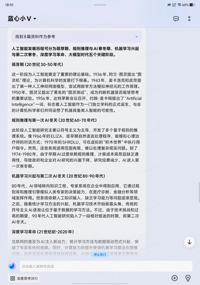 此外,iQOO Pad5e 的 AI 功能也能帮学习 “提效”。“小 V 写作” 可以一键生成简历、演讲稿、文章大纲,比如输入关键词 “人工智能发展历程”,几秒钟就能给出阶段性梳理,再按照这个进行扩展就简单的多了。