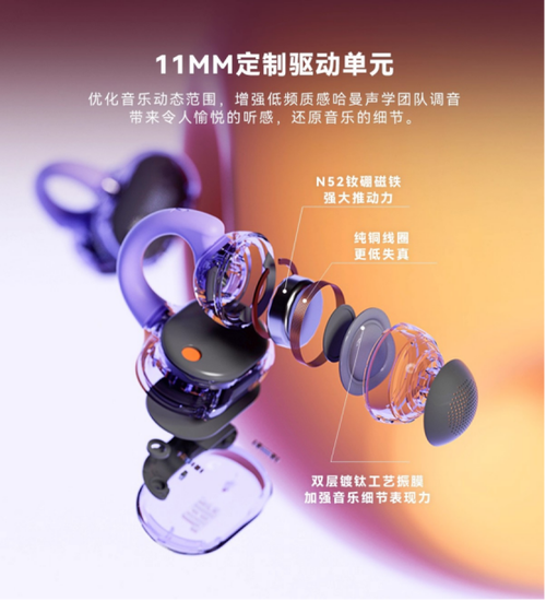 颜值能打,硬件实力也不逊色。耳机搭载 11mm 高品质动圈单元,镀钛双层振膜,还加入自适应低频增强算法,能根据音量自动调节低频量感,让低频听感更具动感,日常追剧、听歌都能拥有十足沉浸感。