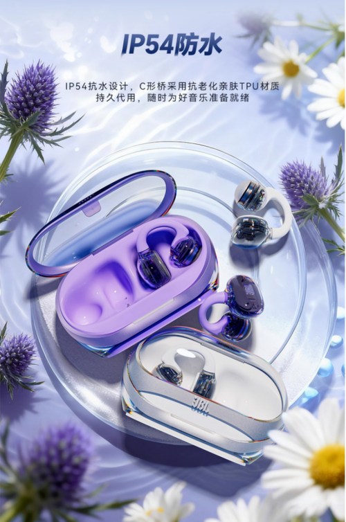 佩戴感也很舒适,耳机单只仅重 6.5 克, C 形过桥设计,搭配抗老化亲肤 TPU 材质,不堵塞耳道,久戴也无负担。再加上 IP54 防水防汗能力,日常运动出汗也能轻松 hold 住,随时随地保持精致状态。