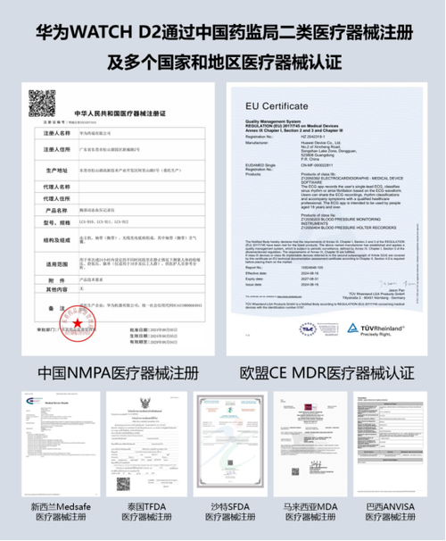 血压测量的需求逐步扩大,而华为深耕血压管理功能,先后推出华为WATCH D 和华为WATCH D2。其中华为WATCH D2 是行业首款获得“动态血压监测医疗认证”的智能手表。它拥有有中国国家药品监督管理局的第二类医疗器械注册证、欧盟的CE MDR医疗器械认证等7个的全球医疗认证。