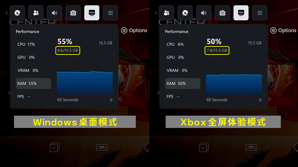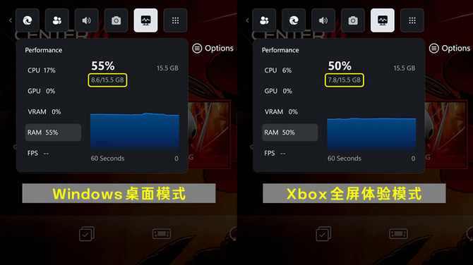 性能永远是游戏设备的核心,通过系统监测界面可以直观看到对比数据:传统Windows桌面模式下内存使用量为8.6GB(占用率55%),而Xbox全屏体验模式下仅为7.8GB(占用率50%)。也就是说,Xbox全屏体验不仅在便利性上有所提升,更在系统层面进行了优化。数据显示,这一界面比传统Windows桌面节省5%以上的内存使用量。