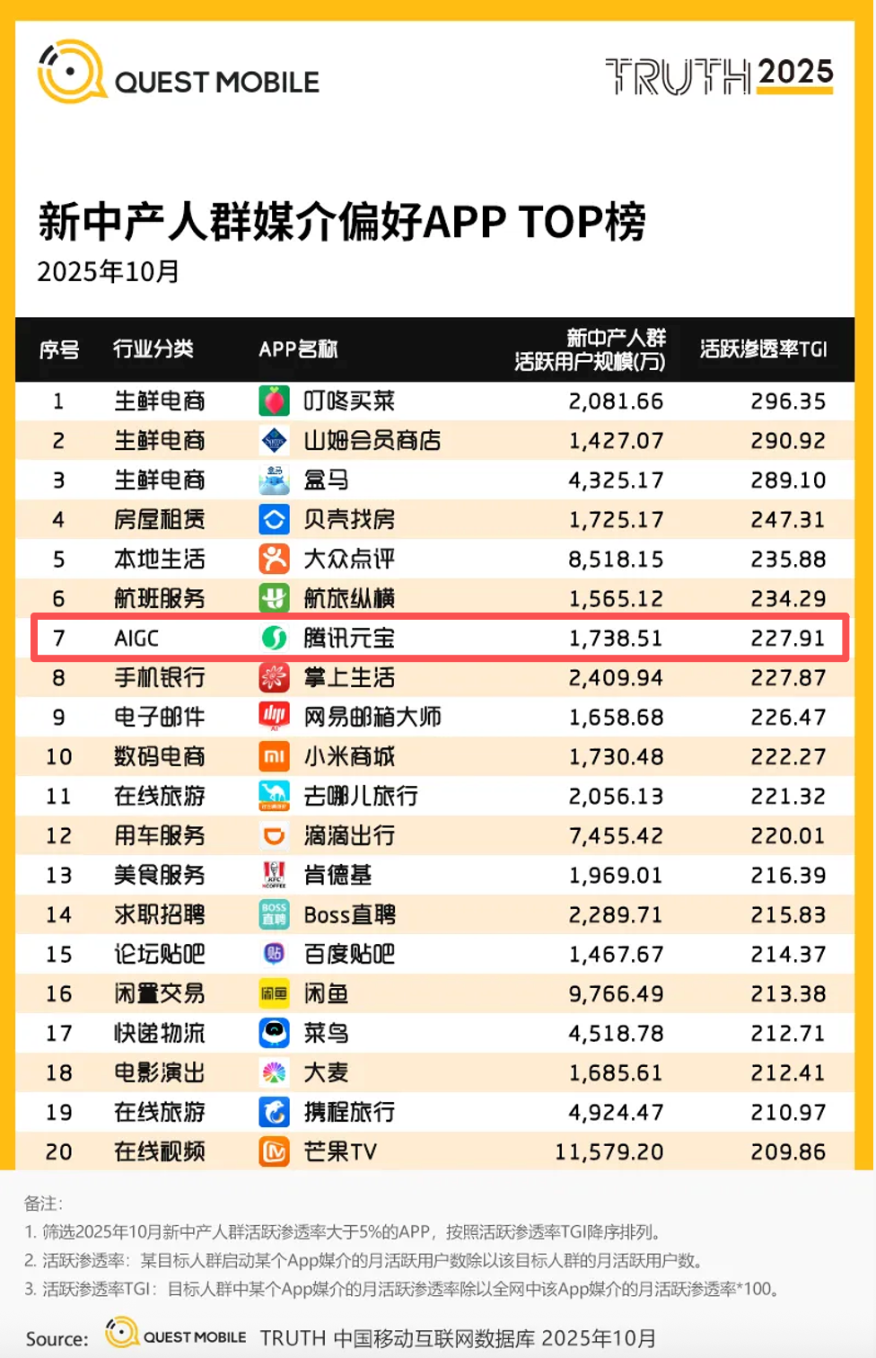 近日,QuestMobile发布的《2025新中产人群洞察报告》显示,我国新中产人群规模已达2.78亿,消费能力与意愿同步提升。值得注意的是,AI工具“腾讯元宝”以1738.51万活跃用户、227.91的活跃渗透率TGI跻身新中产偏好APP榜单第七位,成为AIGC领域唯一上榜应用,标志着AI助手正加速融入新中产数字生活。