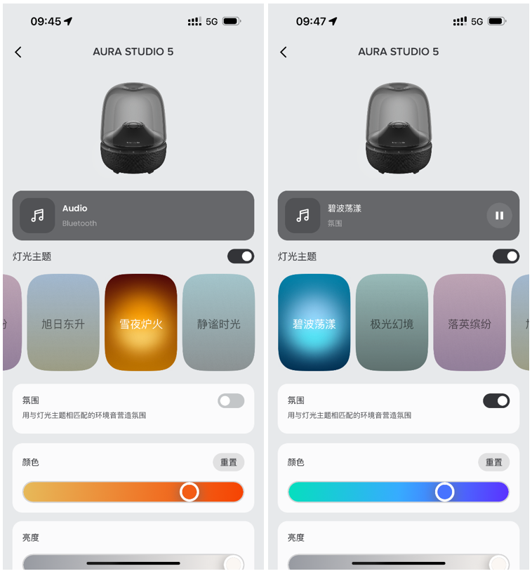 哈曼卡顿音乐琉璃五代的光影设计堪称“空间情绪调节器”。其动态分层光影投射系统支持五大经典主题:海洋、极光、绽放、日出、壁炉,光线可投射至墙面或天花板,当然,你也可以通过Harman/Kardon ONE APP来自定义调节。