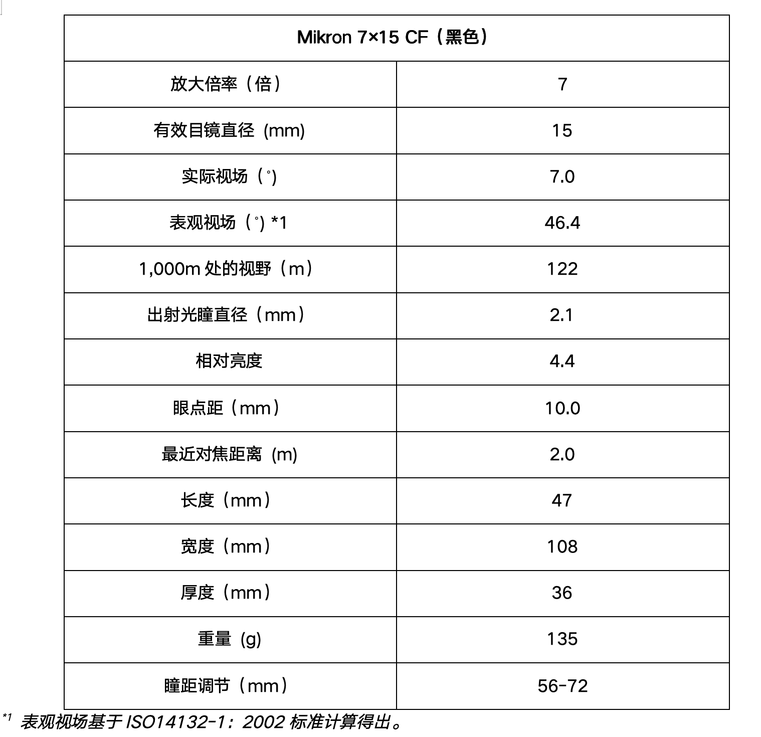 作为系列另一款新作,Mikron 7×15 CF(黑色)以沉稳黑色机身登场,在保留Mikron系列经典基因的同时,着重强化细节观测能力。其同样搭载CF多层镀膜技术,确保高清成像品质。7倍放大倍率让它在细节捕捉上更具优势,能更清晰地呈现远处目标细节,适合需要精准捕捉小目标的场景。15mm有效目镜直径仍能保证充足进光量,配合10mm出瞳距离,戴眼镜的用户也能轻松观测。