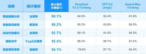 星火X2底座赋能医疗,助力星火医疗大模型核心能力全面提升并持续保持业界领先。基于居民健康档案的智能健康分析、智能报告解读、运动饮食建议、辅助诊疗、智能用药审核等关键任务上,模型能力均显著超越DeepSeek V3.2、GPT-5.2和Qwen3-Max。