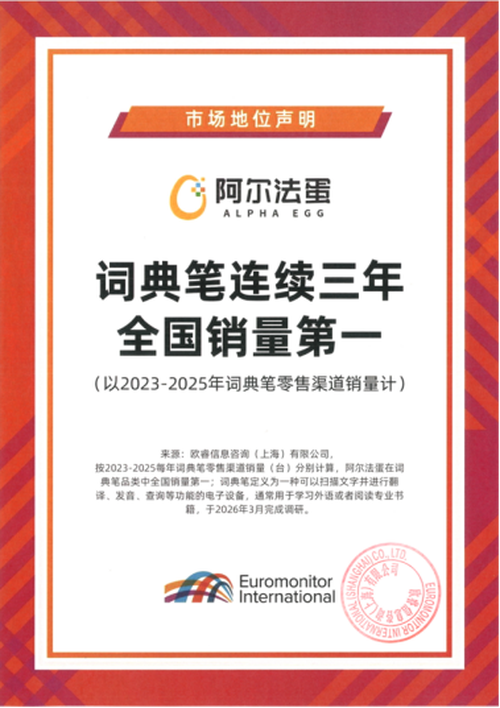 这些年,词典笔渐渐走进千家万户,成为不少孩子学习的得力帮手。而在这一品类中,淘云科技旗下的阿尔法蛋词典笔表现格外亮眼。近日,经权威权威调研机构欧睿咨询认证,阿尔法蛋获得2025年全国词典笔销量第 一,这已是继 2023、2024 年后,第三次登顶词典笔全国销量榜首。