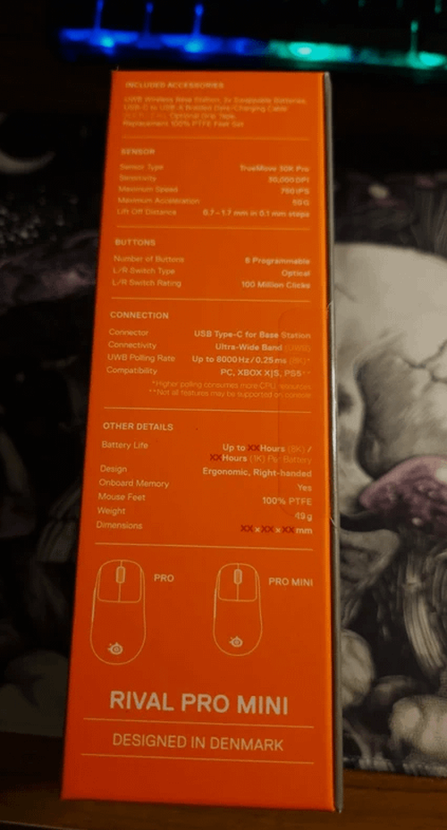 4月8日消息,赛睿 Rival Pro Mini 鼠标早期包装盒图片曝光。该鼠标面向中小手用户,重 49g,基于右手人体工学模具,支持 UWB 通信技术在无线模式下实现 8kHz 回报率。