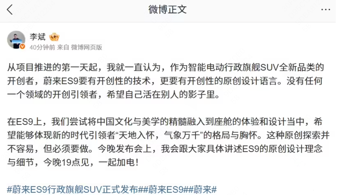4月9日消息,蔚来创始人李斌发文谈及原创设计理念,蔚来 ES9 旗舰 SUV 的外观及内饰情况已公布,新车技术发布会于今晚 19:00 举行。车顶配备一颗激光雷达与两颗角摄像头,内部采用 6 座和 7 座布局。