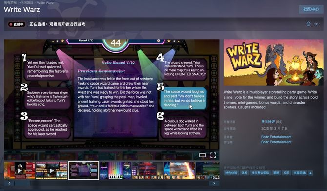 Write Warz 是一款以接龙写故事为核心的多人派对游戏,玩家根据主题写下一句剧情,全体投票选出较精彩的一句。游戏提供恐怖、海盗、奇幻、末日、科幻、西部等多种主题玩法,3.0 正式版还将新增精灵与武士两大阵营对抗主题。