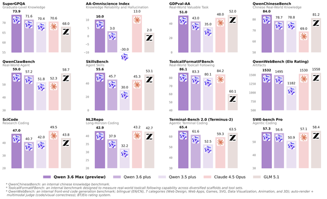 相比 Qwen3.6-Plus,预览版在智能体编程方面取得显著提升,SkillsBench 提升 9.9、SciCode 提升 10.8、NL2Repo 提升 5.0、Terminal-Bench 2.0 提升 3.8。世界知识和指令遵循能力也均有增强。