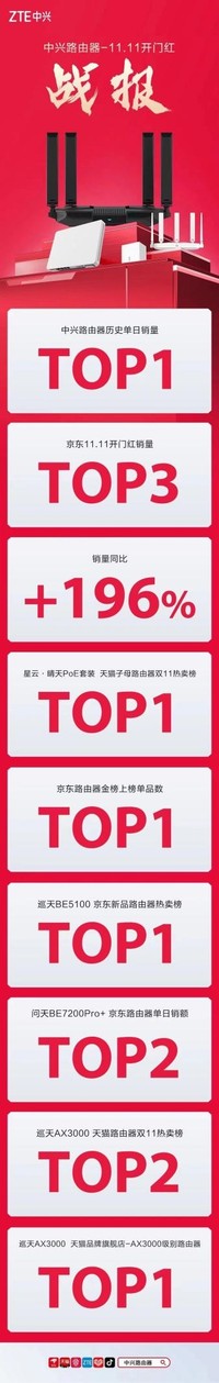11.11 购物狂欢节活动首日,中兴智慧家庭公布了开门红战报。中兴路由器产品在双11活动首日销量同比增长了196%%,再创中兴路由器历史单日销量TOP1;多款路由器拿下京东、天猫等平台的第一,取得了令人瞩目的开门红佳绩,展现了中兴在路由器领域的深厚积淀和强大产品力!