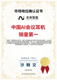 8月28日,国际权威认证机构弗若斯特沙利文(Frost & Sullivan)官网发布至新《市场地位确认证书》,经全方位调研后,明确认定未来智能“中国AI会议耳机销量一”的行业地位。市场表现验证商业模式,沙利文的认证不仅是对未来智能市场竞争力的认可,也是AIGC商业模式能够在智能硬件领域跑通的有力证明。